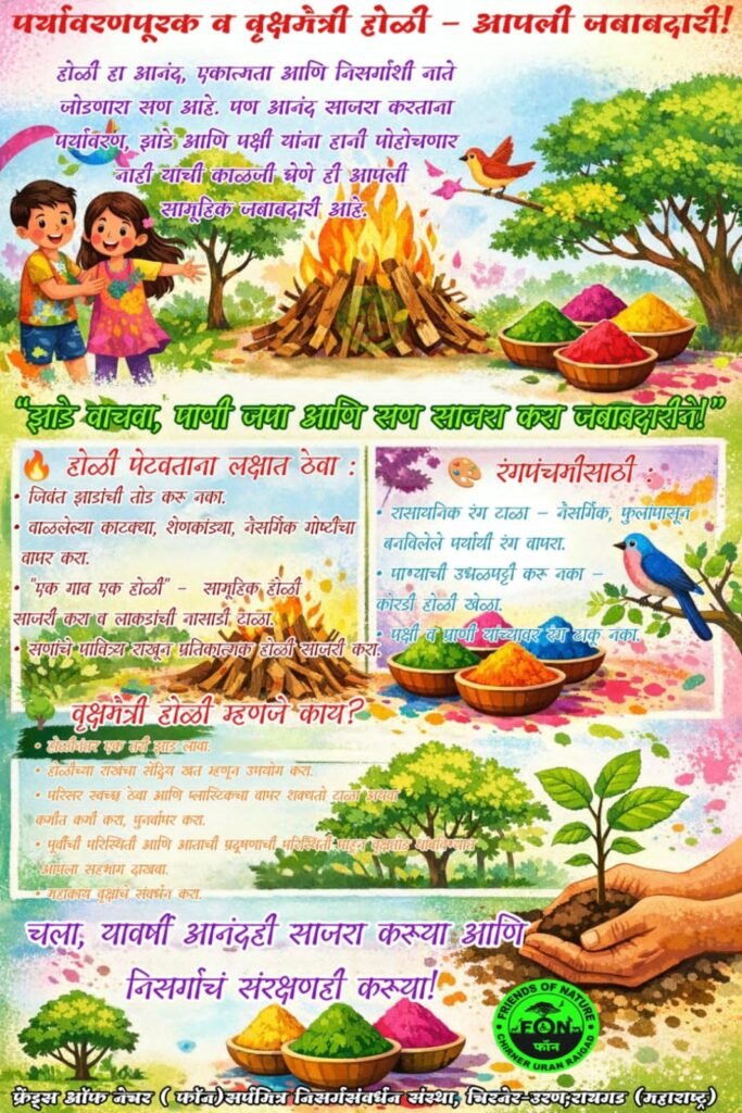 रायगड जिल्ह्यात पर्यावरण संवर्धनासाठी कार्यरत असलेल्या फ्रेंड्स ऑफ नेचर (FON), सर्पमित्र निसर्गसंवर्धन संस्था,चिरनेर-उरण संस्थेच्या वतीने नागरिकांना यावर्षी होळी सण पर्यावरणपूरक व वृक्षमैत्री ने साजरा करण्याचे आवाहन करण्यात आले आहे.संस्थेने प्रसिद्ध केलेल्या जनजागृती संदेशात नमूद करण्यात आले आहे की, होळी हा आनंद, एकात्मता आणि निसर्गाशी नाते दृढ करणारा सण असला तरी सण साजरा करताना झाडांची तोड, रासायनिक रंगांचा वापर आणि पाण्याची उधळपट्टी यामुळे पर्यावरणावर विपरीत परिणाम होत आहे. त्यामुळे सण साजरा करताना पर्यावरण, झाडे व पक्ष्यांचे संरक्षण करणे ही प्रत्येक नागरिकाची सामूहिक जबाबदारी आहे. होळी संदर्भातील मार्गदर्शक सूचना :संस्थेने जिवंत झाडांची तोड न करण्याचे आवाहन केले आहे. होळी पेटवताना वाळलेल्या काटक्या, शेणकांड्या व नैसर्गिक वस्तूंचाच वापर करावा. तसेच “एक गाव – एक होळी” या संकल्पनेतून सामूहिक होळी साजरी करून लाकडांची नासाडी टाळावी, पूर्वीचे व आताचे प्रदूषणाची भीषणता पाहता वृक्षतोड थांबवून प्रतिकात्मक होळी त्याच उत्साहाने साजरी करावी,असे आवाहन करण्यात आले आहे. रंगपंचमीबाबत जागृती :रासायनिक रंग टाळून फुलांपासून तयार केलेले नैसर्गिक रंग वापरावेत, पाण्याची उधळपट्टी टाळून कोरडी होळी खेळावी, तसेच पक्षी, प्राणी व वृक्षांवर रंग टाकू नये, असे स्पष्ट करण्यात आले आहे. ‘वृक्षमैत्री होळी’ उपक्रम :होळीनंतर प्रत्येकाने किमान एक झाड लावून त्याचे संगोपन करण्याचा संकल्प करावा. होळीची राख सेंद्रिय खत म्हणून वापरावी. परिसर स्वच्छ ठेवून प्लास्टिकमुक्त सण साजरा करण्यावरही भर देण्यात आला आहे.फ्रेंड्स ऑफ नेचरच्या या उपक्रमातून “झाडे वाचवा, पाणी जपा आणि सण साजरा करा जबाबदारीने” हा संदेश नागरिकांपर्यंत पोहोचविण्यात येत आहे. पर्यावरणपूरक होळीच खरी सकारात्मक ऊर्जा देणारी होळी असल्याचे संस्थेने नमूद केले आहे.या उपक्रमामुळे उरण परिसरात पर्यावरण संवर्धनाबाबत व्यापक जनजागृती होईल, असा विश्वास व्यक्त केला जात आहे. सणांचे पावित्र्य राखून जर अश्या पद्धतीने होळी व धुलीवंदन साजरा करण्याचे आवाहन करण्यात आले आहे.संस्थेने प्रसिद्ध केलेल्या जनजागृती संदेशात नमूद करण्यात आले आहे की, होळी हा आनंद, एकात्मता आणि निसर्गाशी नाते दृढ करणारा सण असला तरी सण साजरा करताना झाडांची तोड, रासायनिक रंगांचा वापर आणि पाण्याची नाहक उधळपट्टी यामुळे पर्यावरणावर विपरीत परिणाम होत आहे. त्यामुळे सण साजरा करताना पर्यावरणाचे संरक्षण करणे ही प्रत्येक नागरिकाची सामूहिक जबाबदारी आहे.संस्थेने जिवंत झाडांची तोड न करण्याचे आवाहन केले आहे. होळी पेटवताना वाळलेल्या काटक्या, शेणकांड्